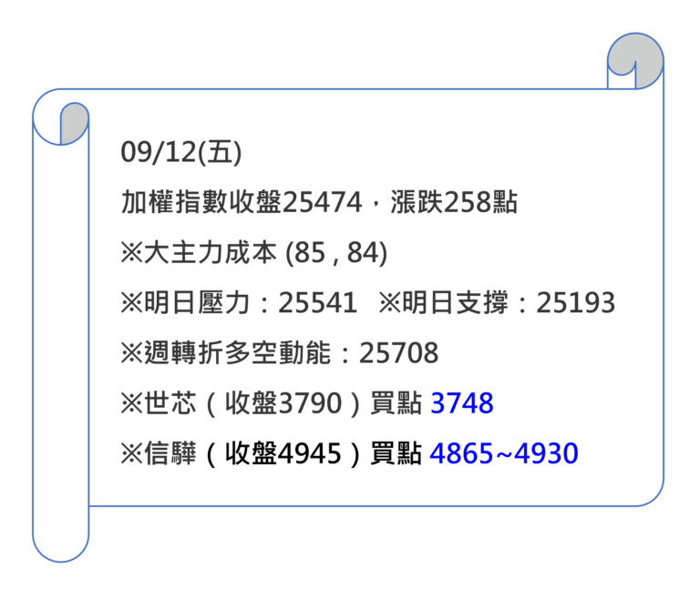 09/12(五)加權收盤25474,漲跌258點